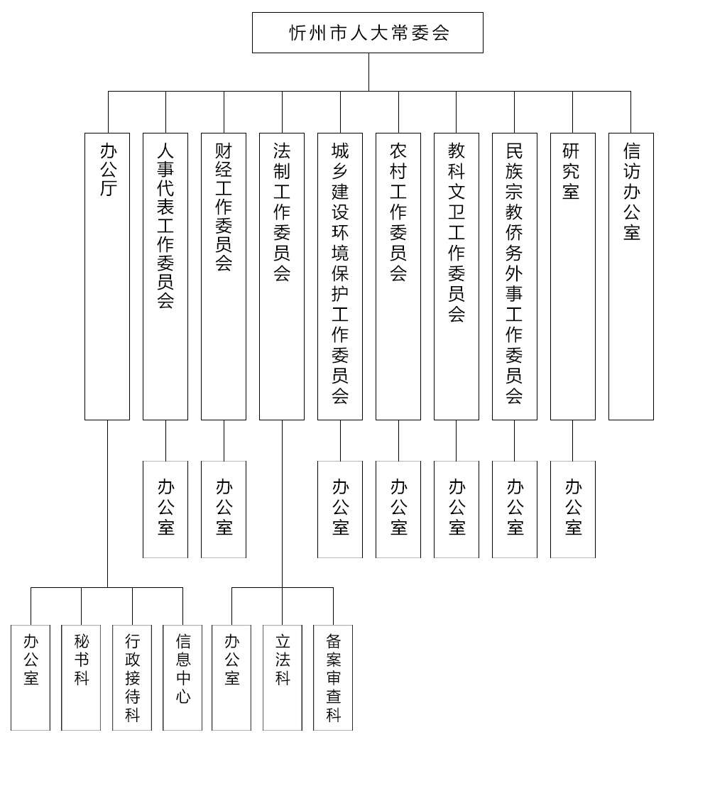 根据《中华人民共和国地方各级人民代表大会和地方各级人民政府组织法》,忻州市人民代表大会常务委员会设置办公厅、人事代表工作委员会、财经工作委员会、法制工作委员会、城乡建设环境保护工作委员会、农村工作委员会、教科文卫工作委员会、研究室、民族宗教侨务外事工作委员会、信访办公室十个工作机构。
